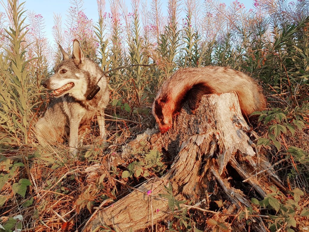 Jämthundstiken Johnna poserar med sitt byte i morgonljuset. Foto Hampus Millestu