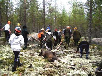 Nu sattes muskler och laganda på prov när älgen skulle dras fram ur skogen, över stubbar och stenar, mellan träd och grenar. Ung och äldre, alla hjälptes åt att dra