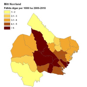 I Västernorrland ökade antalet fällda djur med 415 och totalt fälldes 8 572 älgar. Mest älg sköt jägarna i Indals-Lidens jaktvårdskrets söder om älven där avskjutningen stannade på 6,2 älgar per 1 000 hektar.