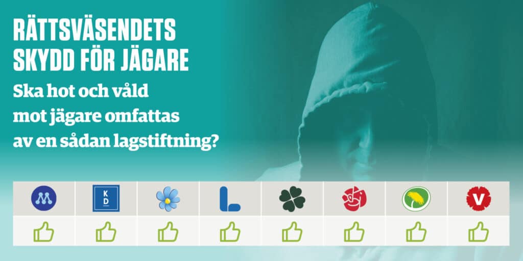 Fråga 12 i Svensk Jakts partiledarenkät.Regeringen föreslår skärpta straff för djurrättsaktivister som begår brott mot lantbrukare och djurhållare. Jägare nämns inte i lagförslaget.